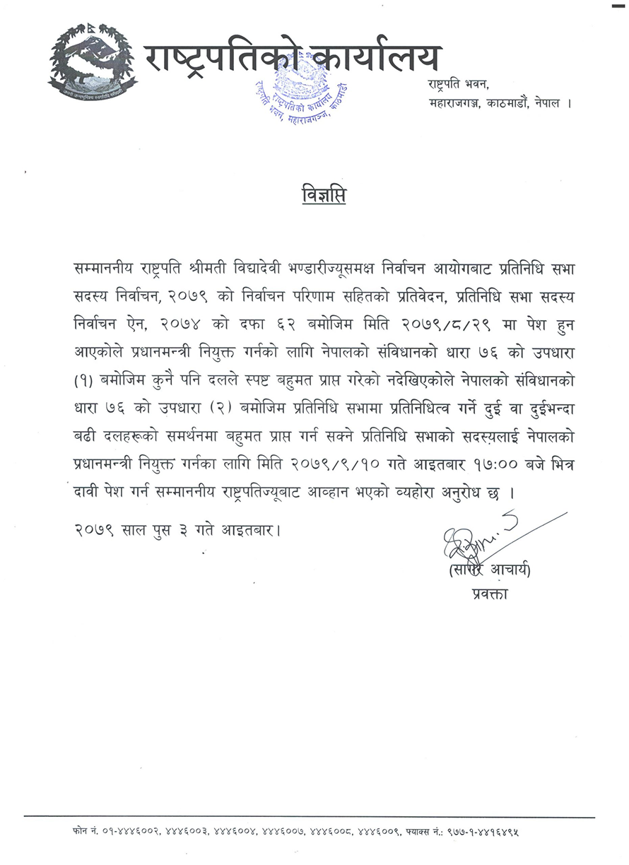 राष्ट्रपति विद्यादेवी भण्डारीले सरकार गठनका लागि आह्वान गरेकी छन् । आइतबार उनले संविधानको धारा ७६ ९२० अनुसार सरकार गठन गर्न ७ दिनको समय दिएकी हुन् । संविधानको उक्त व्यवस्था अनुसार प्रतिनिधिसभामा दुई वा दुई भन्दा बढी दलको समर्थनमा बहुमत जुटाउन सक्ने प्रतिनिधिसभा सदस्यले प्रधानमन्त्री दावी गर्न सक्ने छ ।
