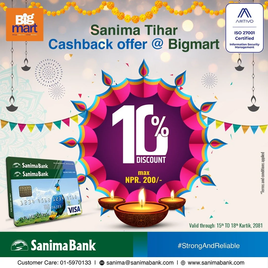 काठमाडौँ । सानिमा बैंकले आफ्ना ग्राहकहरुलाई डिजिटल बैंकिङ्गका माध्यमहरु प्रयोग गरी डिजिटल भुक्तानीको प्रोत्साहन गर्न बिगमार्ट (मेगा मार्ट प्रा.लि.) सँग सहकार्य गरेर छुटको व्यवस्था गरेको छ । उक्त व्यवस्था अन्तर्गत सानिमा भिसा डेबिट/क्रेडिट कार्ड मार्फत भुक्तानी गर्दा १०% वा रु. २०० सम्म छुट प्राप्त गर्न सक्नेछन् । तिहारको अवसरमा ल्याइएको यो अफर कार्तिक १५ देखि…