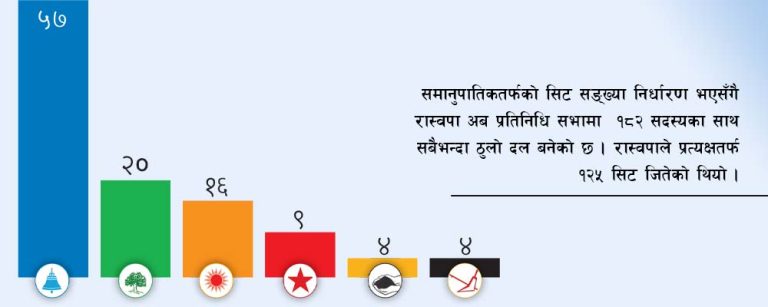 समानुपातिकतर्फको सिट सङ्ख्या निर्धारण भएसँगै रास्वपा अब प्रतिनिधि सभामा १८२ सदस्यका साथ सबैभन्दा ठुलो दल बनेको छ । रास्वपाले प्रत्यक्षतर्फ १२५ सिट जितेको थियो ।