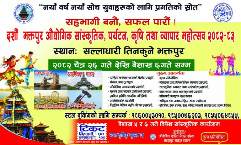 भक्तपुर – नयाँ वर्ष २०८३ तथा बिस्का जात्राको पूर्वसन्ध्यामा भक्तपुरको सल्लाघारीमा ‘१०औँ भक्तपुर औद्योगिक, सांस्कृतिक, पर्यटन, कृषि तथा व्यापार महोत्सव’ भव्य रूपमा सुरु भएको छ।