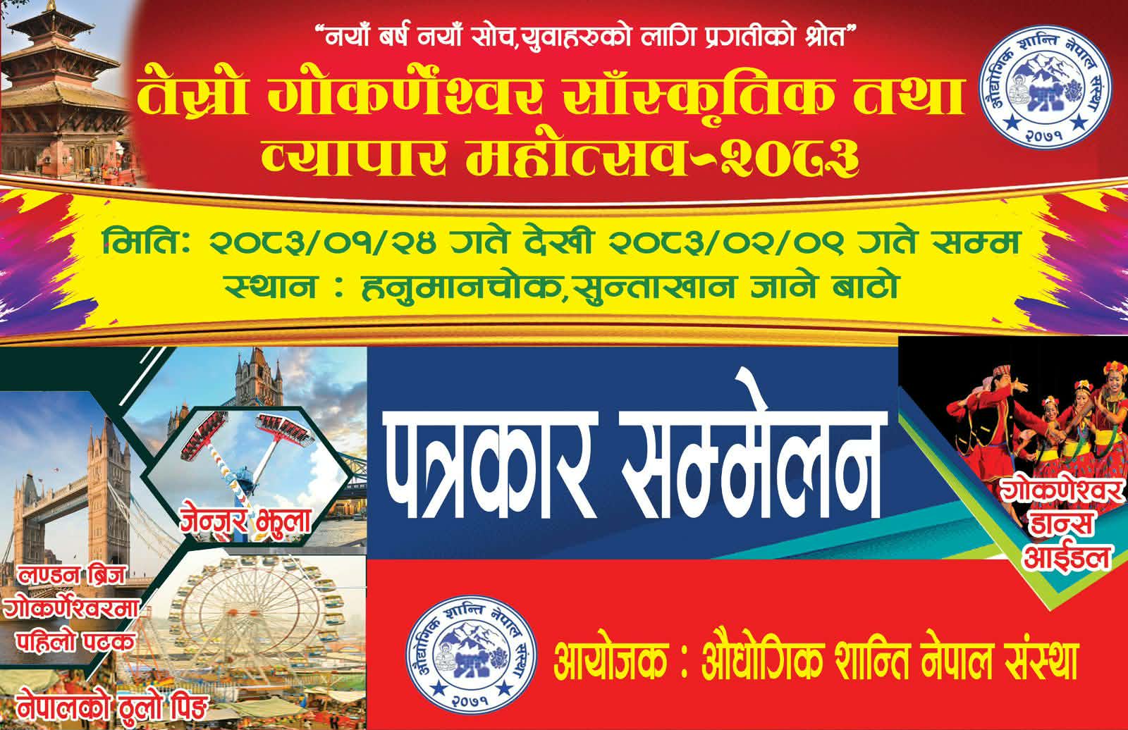 काठमाडौँ, वैशाख १४ । नयाँ वर्ष २०८३ को पावन अवसरमा गोकर्णेश्वर नगरपालिकामा ‘तेस्रो गोकर्णेश्वर औद्योगिक, सांस्कृतिक, पर्यटन, कृषि तथा व्यापार महोत्सव’ आयोजना हुने भएको छ। औद्योगिक शान्ति नेपाल संस्थाको आयोजनामा गोकर्णेश्वर–४ स्थित हनुमान चोकमा आगामी वैशाख २४ गतेदेखि जेठ ९ गतेसम्म महोत्सव संचालन हुन लागेको हो।