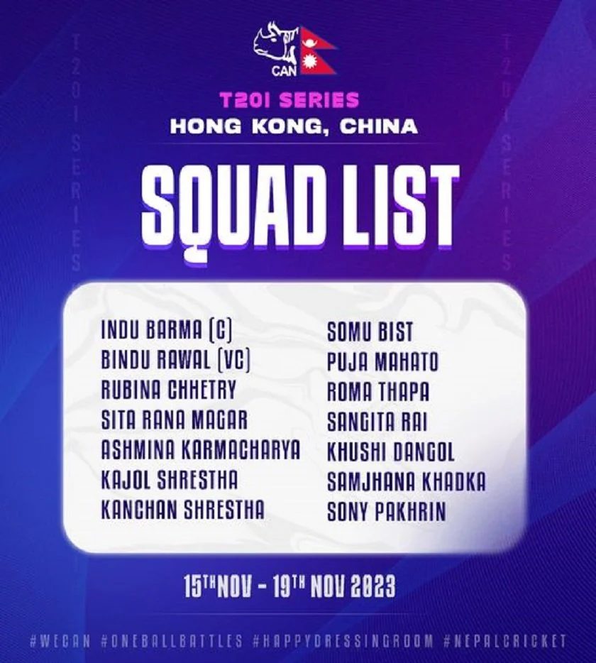 टी—२० शृंखला नोभेम्बर १५ तारिखदेखि सुरु हुनेछ । हङ्कङ भ्रमणका लागि घोषित टोलीमा उपकप्तानको जिम्मेबारी विन्दू रावललाई दिइएको छ । यसअघि राष्ट्रिय महिला टोलीको कप्तानको भूमिकामा रुविना क्षेत्री रहेकी थिइन् ।