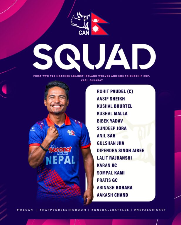 काठमाडौँ । नेपाल क्रिकेट संघ (क्यान) ले आयरल्यान्ड ‘ए’ विरुद्धको टी–२० शृङ्खलाका लागि नेपाली टोलीको घोषणा गरेको छ । क्यानले बुधवार रोहित पौडेलको कप्तानीमा १५ सदस्यीय टोलीको घोषणा गरेको हो ।