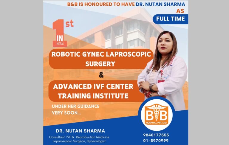 काठमाडौं । टेस्टट्युब बेबी विशेषज्ञ,वरिष्ठ गाइनो ल्याप्रोस्कोपिक सर्जन तथा बाँझोपन विज्ञ, डा. नूतन शर्माले अब बी एण्ड बी हस्पिटलमा चिकित्सकको रूपमा सेवा सुरू गर्ने भएकी छिन्।