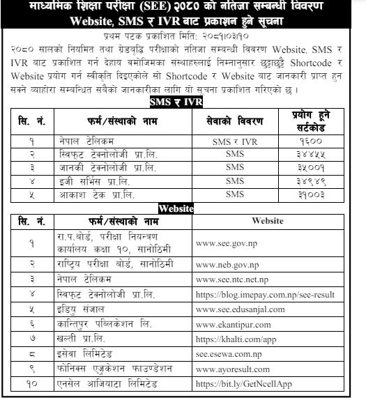 बोर्डले एसइई नतिजा हेर्न परीक्षार्थीका लागि सार्वजनिक सूचना यसअघि नै जारी गरेर जानकारी दिइसकेको छ । एसइई नतिजा वेबसाइट, एसएमएस र आइभिआरबाट हेर्न सकिनेछ ।