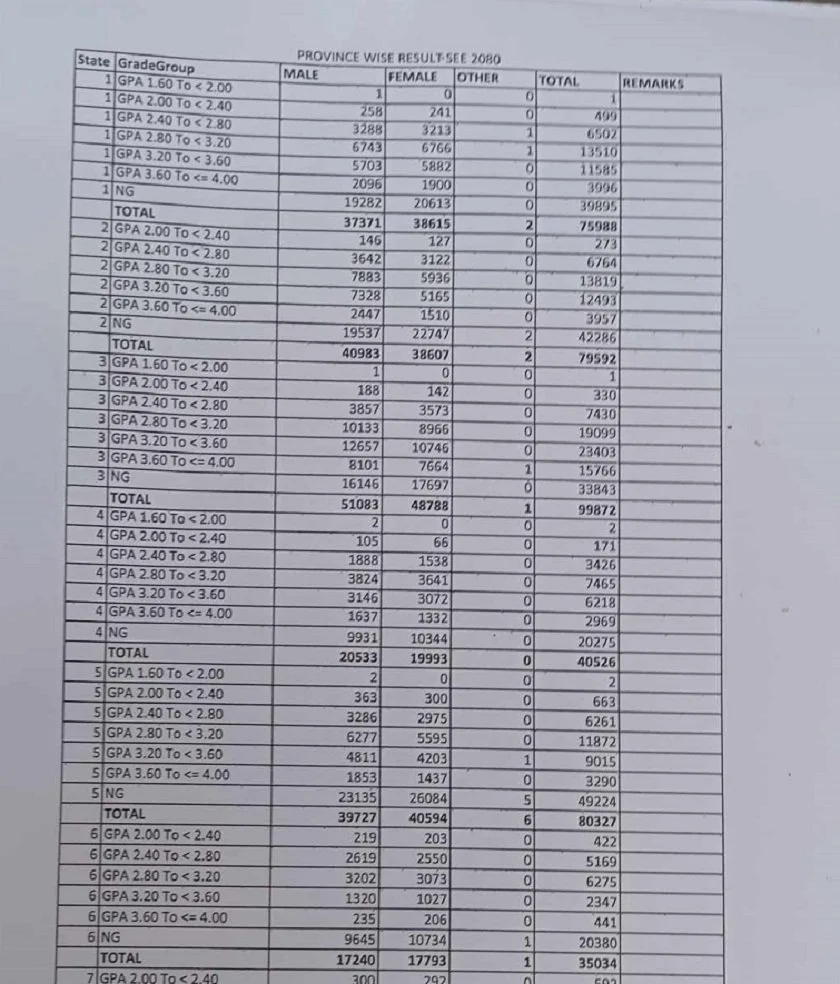 उत्तीर्ण हुने भएकाहरूको जीपीए र समग्र प्रदेशगत नतिजा यस्तो छ