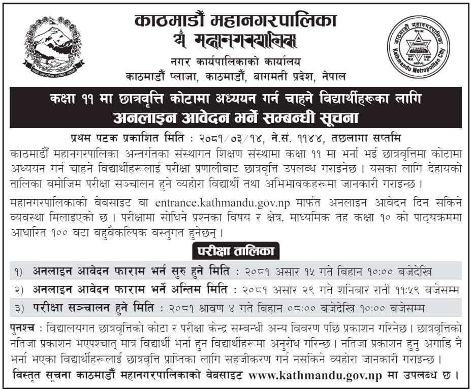 काठमाडौँ । काठमाडौँ महानगरपालिकाले आफू मातहतका संस्थागत शिक्षण संस्थामा कक्षा ११ मा भर्ना भई छात्रवृत्तिमा कोटामा अध्ययन गर्न चाहने विद्यार्थीहरूलाई परीक्षा प्रणालीबाट छात्रवृत्ति उपलब्ध गराइने बताएको छ ।