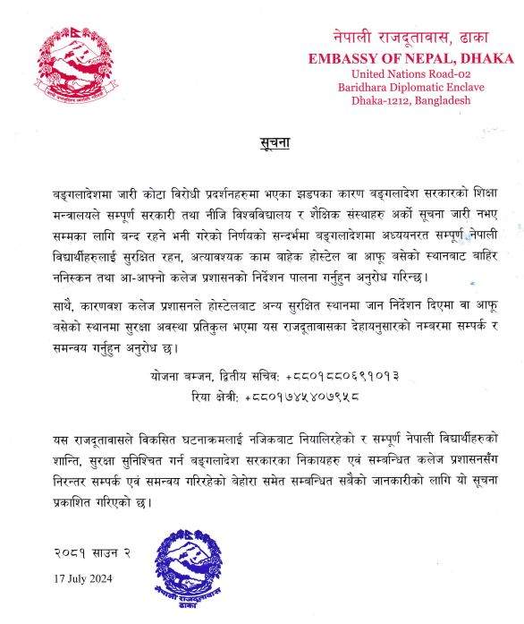 बंगलादेशमा जारी कोटा विरोधी प्रदर्शनहरूमा भएका झडपलाई मध्यनजर गर्दै नेपाली दूतावासले नेपाली नागरिकलाई अत्यावश्यक कामबाहेक बाहिर ननिस्कन सचेत गराएको हो ।