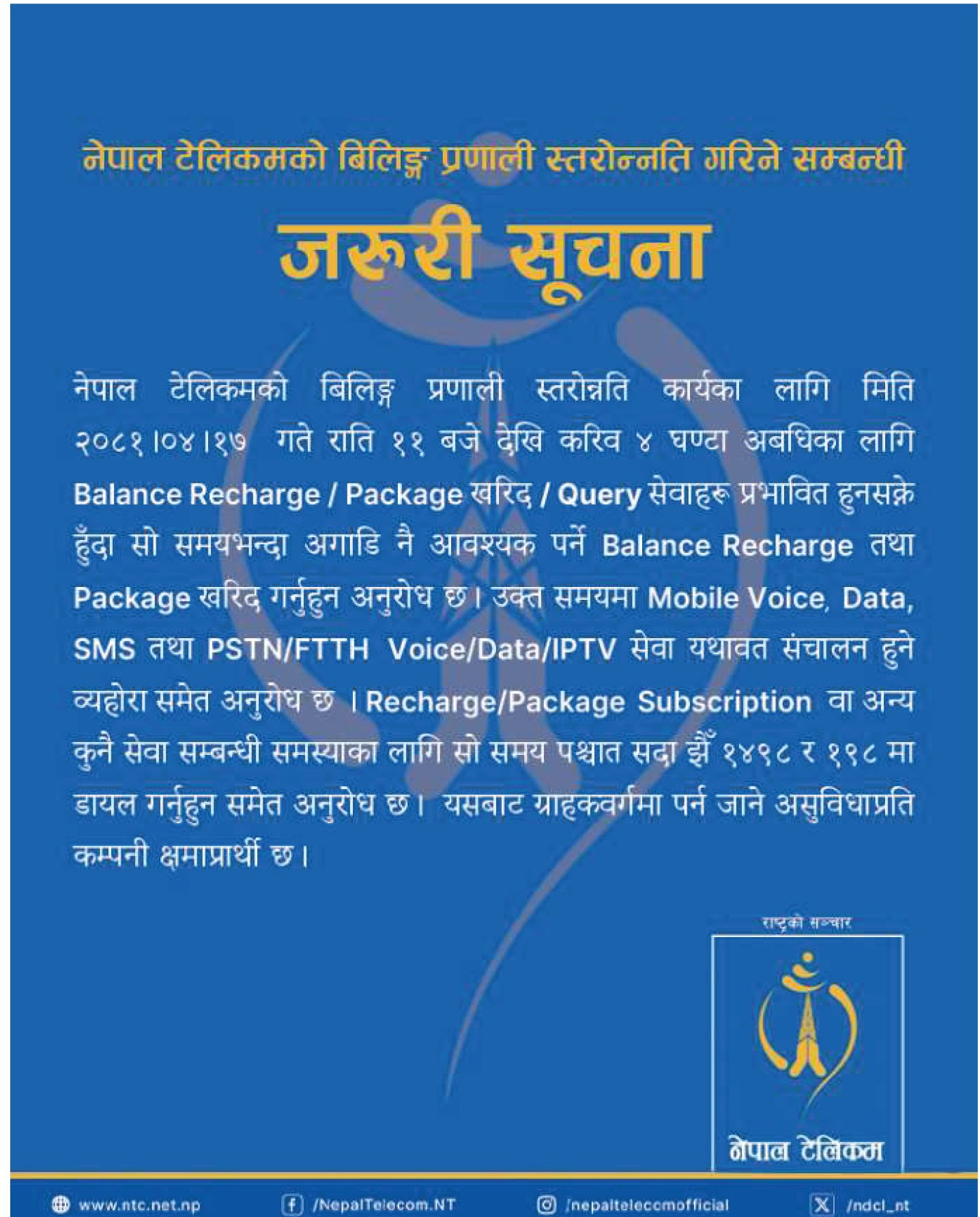 उनका अनुसार उक्त समयमा रिचार्ज र डाटा प्याकेज अवरुद्ध हुनेछ । कम्पनीले बिलिङ प्रणाली स्तरोन्नति गर्नका लागि चार घण्टा ती सेवा अवरुद्ध गर्नुपर्ने भएको जनाएको छ । तर उक्त समयमा मोबाइल भ्वाइस, डाटा एसएमएस, तथा पीएसटीएन, एफटीटीएच, आइपीटीभी सेवा यथावत सञ्चालन हुने टेलिकमले जारी गरेको सूचनामा भनिएको छ ।